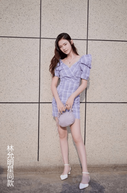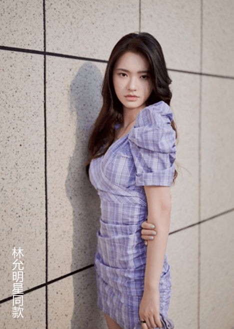 林允身着的这款蓝色格纹裙在设计中充满巧思,泡泡袖与收腰设计为随性的蓝色格纹增添了几分正式感,让这款裙装能满足更多场合的着装需求;交叉式的上半身设计,个性复古;褶皱的裙身部分更呈现出几分漫不经心的慵懒风情。